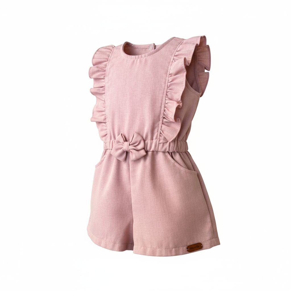 👧 Macacão Infantil Rosa em Linho Misto com Babados e Bolsos Laterais