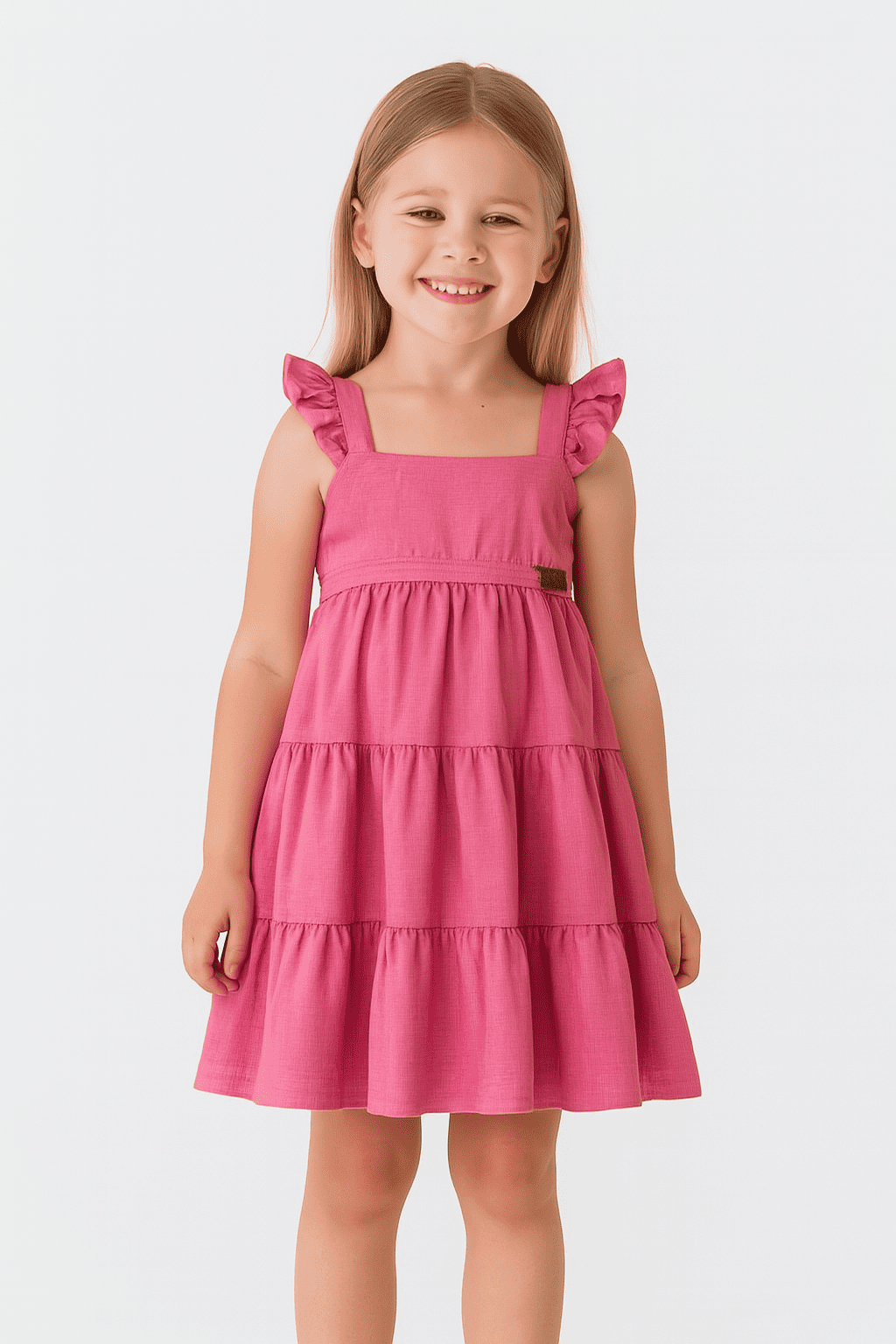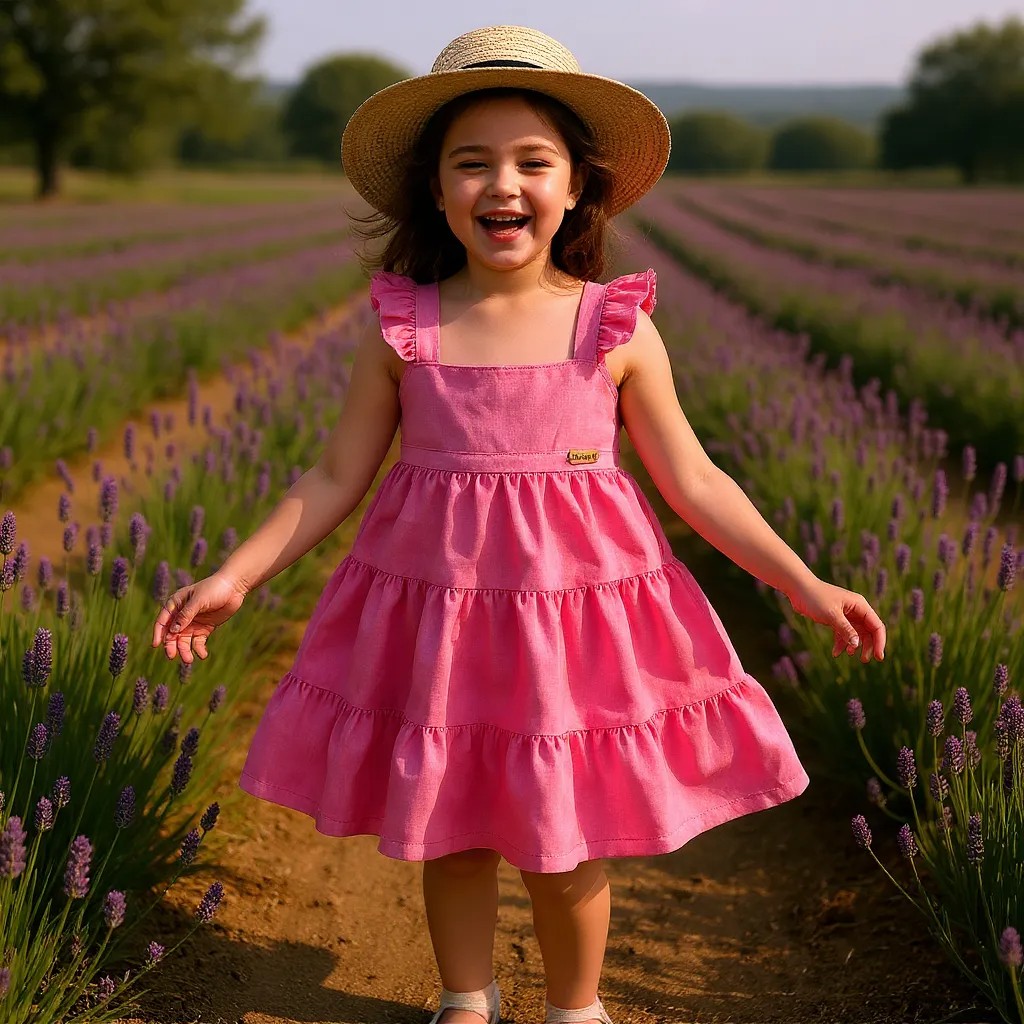 Encante-se com este vestido infantil rosa, feito em linho leve e respirável, ideal para os dias mais quentes. O design delicado conta com alças com babados e uma saia em camadas franzidas, que garantem movimento e charme em cada passo.
